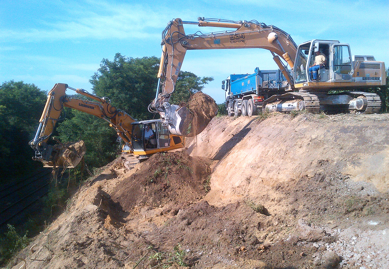 Grâce à notre matériel de terrassement, nous pouvons procéder à l’évacuation de la terre lors des travaux de déblai. Ces travaux de décaissement de terrain sont nécessaires pour préparer nos différents activités : aménagement d’allées, de cours et de jardins, mais aussi d’ouvrages ^mus conséquents comme les voiries communales, les lotissements, les plateformes industrielles et agricoles, l’élargissement de voies SNCF, la création de bassins de stockage et autres ouvrages hydrauliques, de digues de retenue.